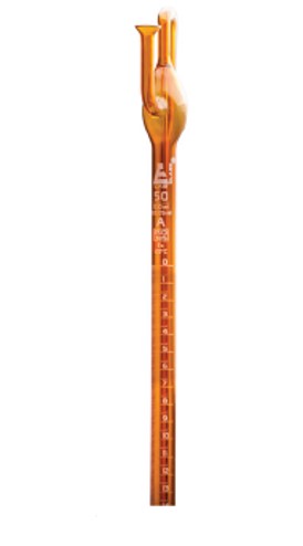 CH0242A-AM Bureta de 10ml de vidrio borosilicato ámbar con llave de plástico PTFE clase A, graduación blanca, reservorio de 1000ml, junta 29/32, cumple la norma DIN ISO 385, calibración TD para entregar una cantidad precisa, cuenta con certificado por lotes Eisco