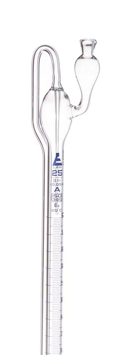 CH0242B Bureta de 25ml de vidrio borosilicato con llave de plástico PTFE clase A, graduación azul, reservorio de 1000ml, junta 29/32, cumple la norma DIN ISO 385, calibración TD para entregar una cantidad precisa, cuenta con certificado por lotes Eisco