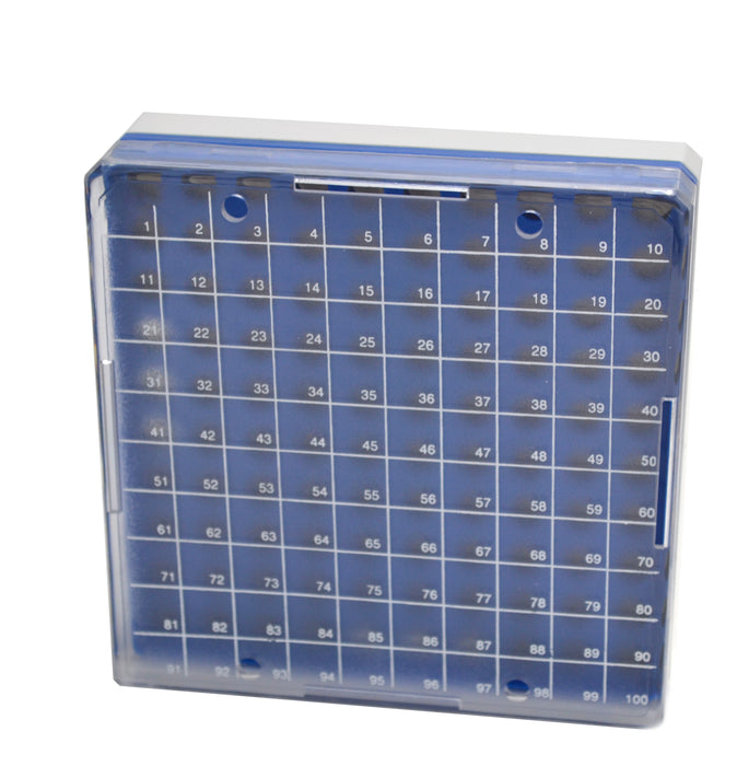 CH0288A Caja de plástico policarbonato de alta calidad con tapa, para almacenar 100 microtubos de 0.5ml. Cuenta con índice numérico para rápida identificación. Soporta temperaturas de -190° a 121°C, autoclavable Eisco