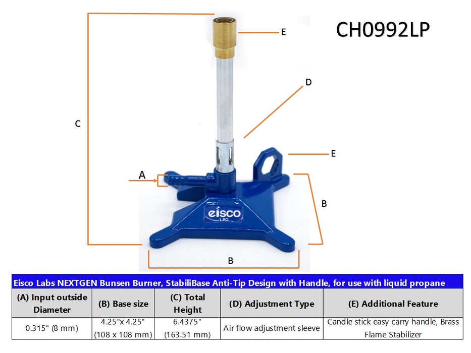 CH0992LP Mechero de Bunsen con estabilizador de flama y base anti volcadura con asa cubierta resistente a químicos, para gas LP, con válvula de aire para el control de la flama, para usar con mangueras con un diámetro interno de 6-8mm Eisco