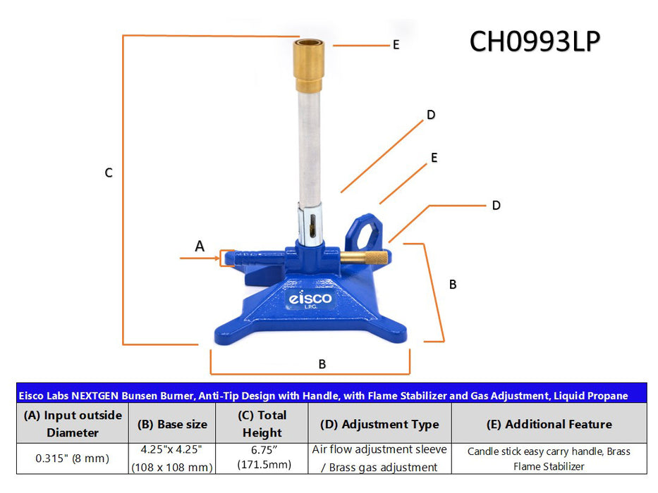 CH0993LP Mechero de Bunsen con estabilizador de flama y base anti volcadura con asa cubierta resistente a químicos, para gas LP, con válvula de aire para el control de la flama, para usar con mangueras con un diámetro interno de 6-8mm.